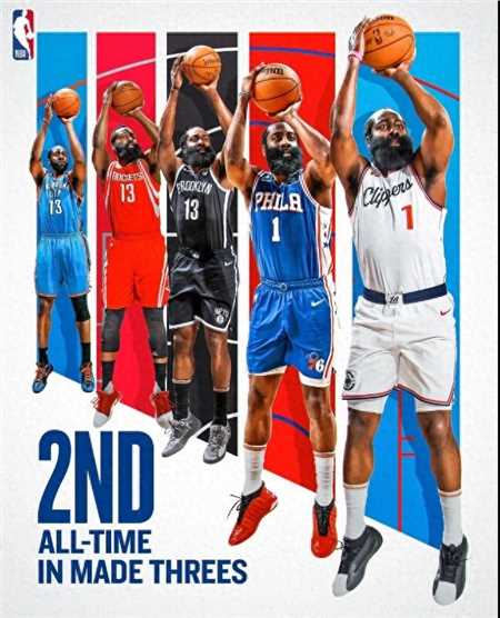 哈登在本场投进两记三分球,生涯三分命中数(2975)超越雷-阿伦(2973)独享历史第二,仅次于斯蒂芬-库里(3782)。三分榜单被09届两位最好的球员霸占。