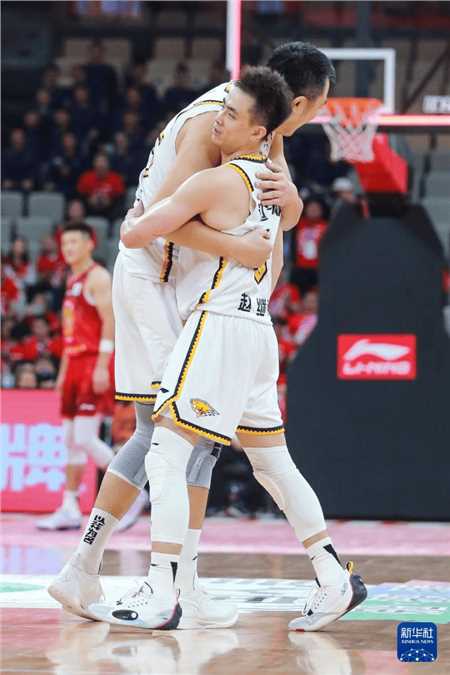 12月1日,辽宁本钢队球员赵继伟与队友韩德君庆祝比赛获胜。