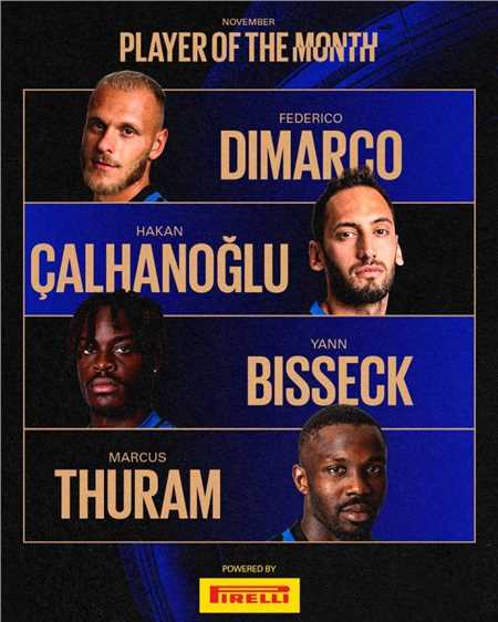国际米兰官方公布了球队11月最佳球员候选名单,分别是恰尔汗奥卢、迪马尔科、比塞克和马库斯-图拉姆。