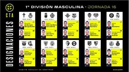西班牙足协官方公布了西甲第16轮比赛裁判安排,希尔-曼萨诺将执法赫罗纳vs皇家马德里,亚历杭德罗-穆尼斯执法皇家贝蒂斯vs巴塞罗那。