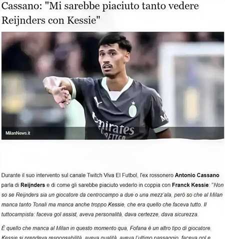 卡萨诺谈雷恩德斯,称很希望看到凯西和其搭档。这样米兰的中场就完美了,因为凯西能做很多事情。这是米兰现在所缺少的,凯西总能出现在球队需要的位置,我很希望看到他和赖因德斯搭档中场。雷恩德斯与福法纳是同一类型球员,他们都是边后腰,都需要身边有打手,雷恩德斯在荷兰国家队表现出色得益于有两个人在梳理传球和防守,而米兰没有人做这个工作,或者说米兰期望雷恩德斯做梳理与防守的工作。米兰买来福法纳一直说期望福法纳承担更多防守任务,不理解为啥不买科内,科内就是那个能承担防守的球员,福法纳往好的方面理解是攻守兼备的球员。哈维对凯西的评价为不会向前的中场球员,我觉得哈维评价正确,他肯定是不适合巴萨那样层层推进的球队,但是他适合米兰稳守反击的方式。