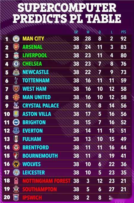 超级计算机预测,曼城将再次夺冠,阿森纳排名第2,利物浦和切尔西分列3、4名,曼联只积58分再次排名第8。
