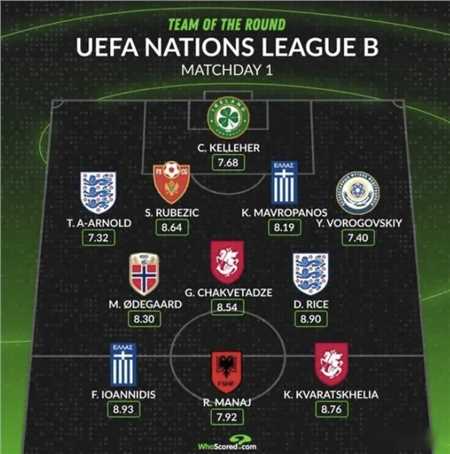 目前,欧国联b级联赛第一轮的比赛已经战罢。whoscored列出了首轮评分最佳阵容。