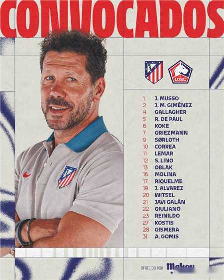 前锋:7-格列兹曼、9-瑟洛特、10-安赫尔-科雷亚、12-萨穆埃尔-利诺、17-罗德里戈-里克尔梅、19-阿尔瓦雷斯、22-朱利亚诺-西蒙尼