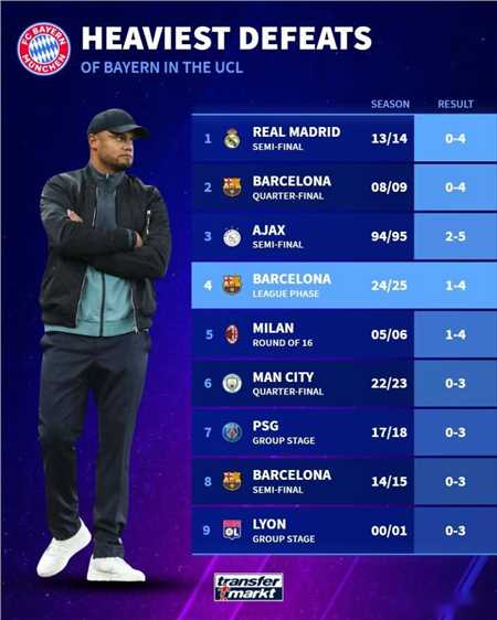 北京时间10月24日欧冠第三轮,巴萨主场4-1战胜拜仁。赛后,德国转会市场列出了拜仁在欧冠中最大比分失利的榜单,巴萨占据3席。